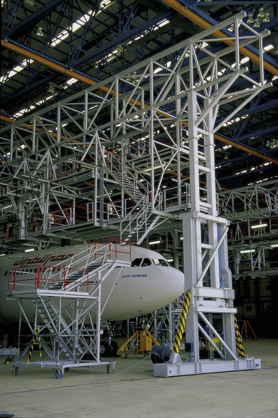 應(yīng)用圖例: Mero Airporttechnik 高性能蝸輪絲杠升降機,用于調(diào)節(jié)飛機維修平臺的高度。