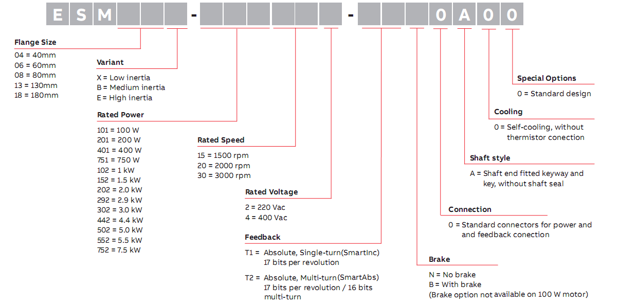 ESM系列伺服電機(jī)用于高動(dòng)態(tài)精度的運(yùn)動(dòng)控制由于其轉(zhuǎn)矩密度高,ESM系列伺服電機(jī)具有高動(dòng)態(tài)響應(yīng)。單圈和多圈高分辨率值編碼器反饋可選件可匹配應(yīng)用要求。ESM系列電機(jī)外殼符合IP65防護(hù)等級(jí)。額定功率從0.1kW至7.5kW,五個(gè)標(biāo)準(zhǔn)的框架法蘭尺寸為40,60,80,130和180毫米,可添加制動(dòng)可選件。框架40-80法蘭的電機(jī)提供引出線,方便電機(jī)動(dòng)力和反饋的連接。
